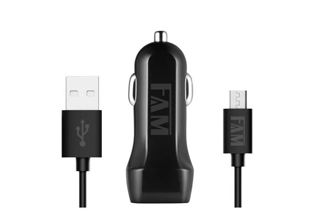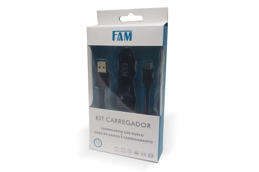 160517 – KIT CARREGADOR VEICULAR 2USB 2.1A + CABO MICRO USB V8 FKV-812 FAM